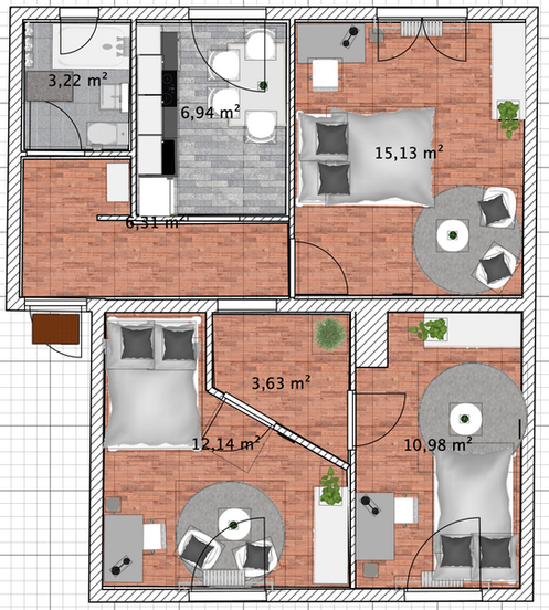 Du findest auf unserer Webseite in der Detailansicht der Zimmer hochaufgelöste Fotos der gesamten Wohnung.